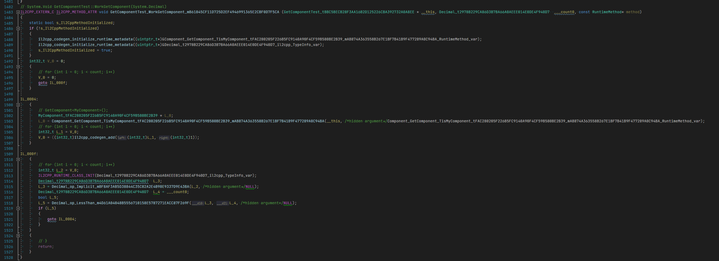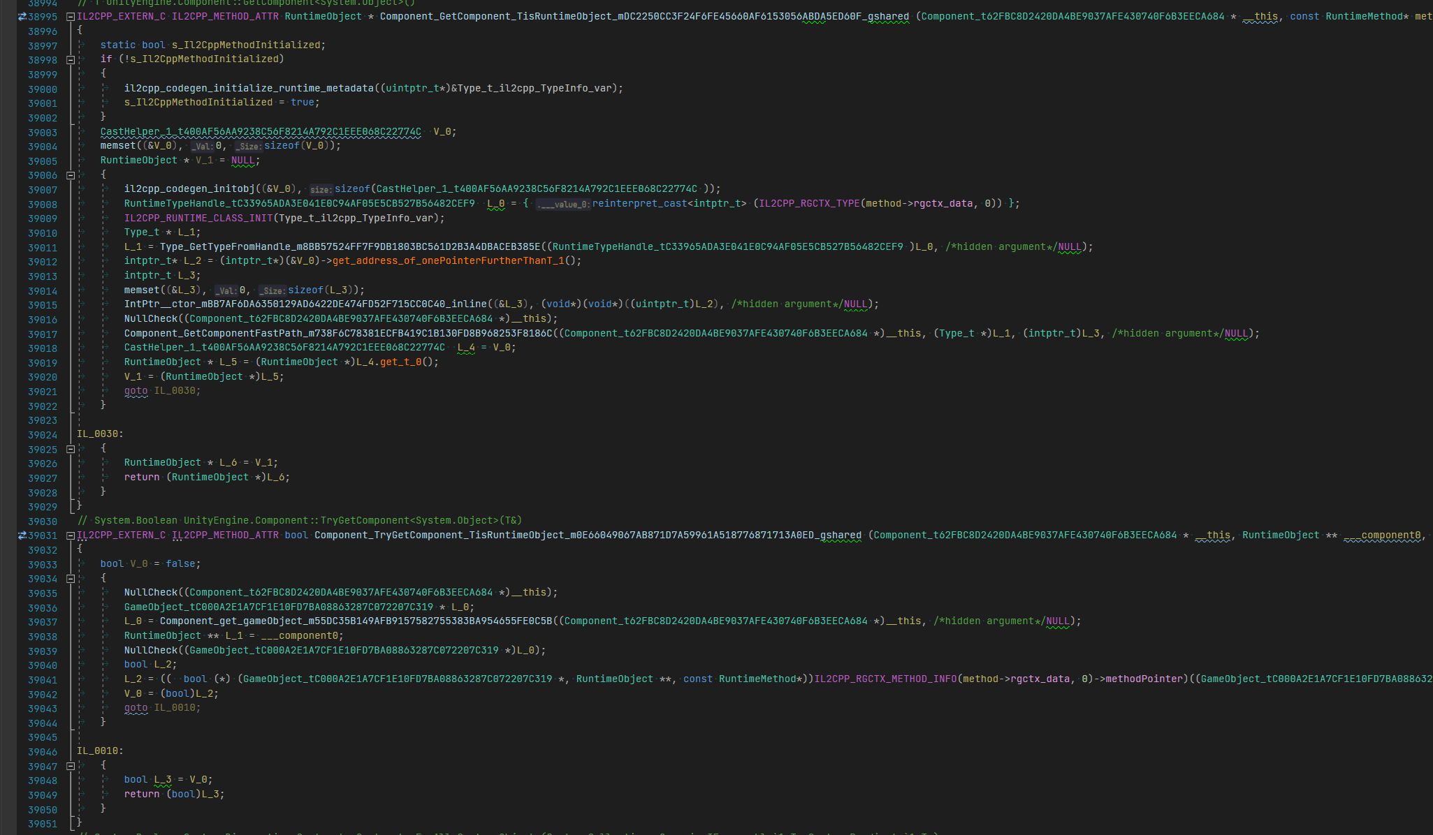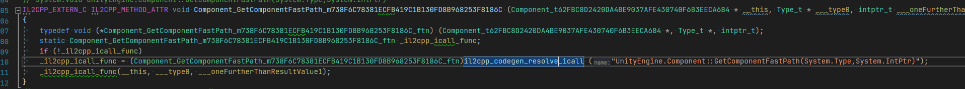 goto를 이용해 루프를 처리하고 있고, 제네릭 GetComponent<T> 대신에 각 타입별로 생성된 코드를 통해 네이티브 코드 호출을 시도합니다. 생성된함수가 가리키고 있는 제네릭 함수는 아래와 같습니다.
