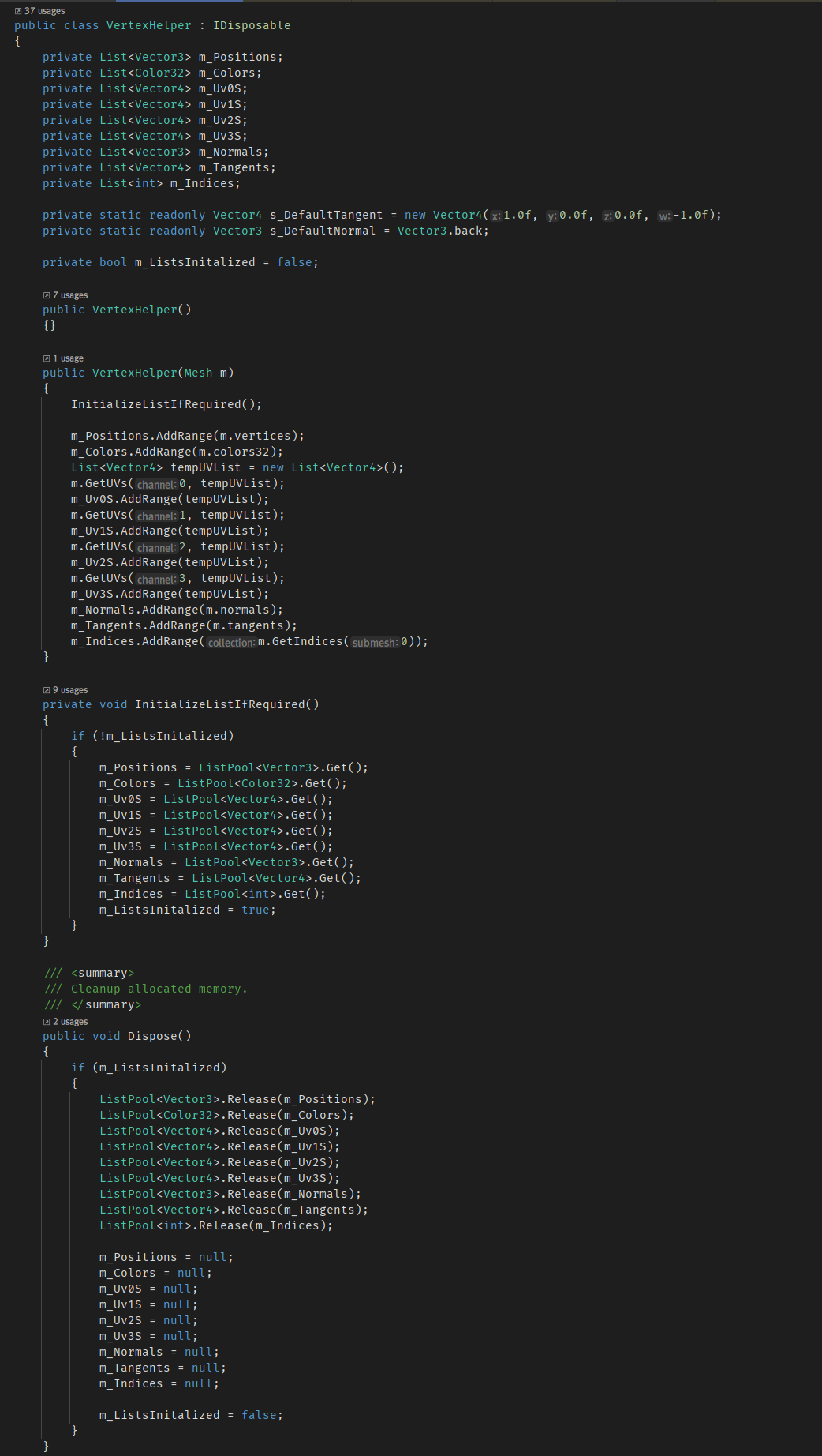 uGUI의 Text 컴포넌트에서 사용되는 VertexHelper 클래스는 이를 리스트풀을 이용해 구현했습니다.