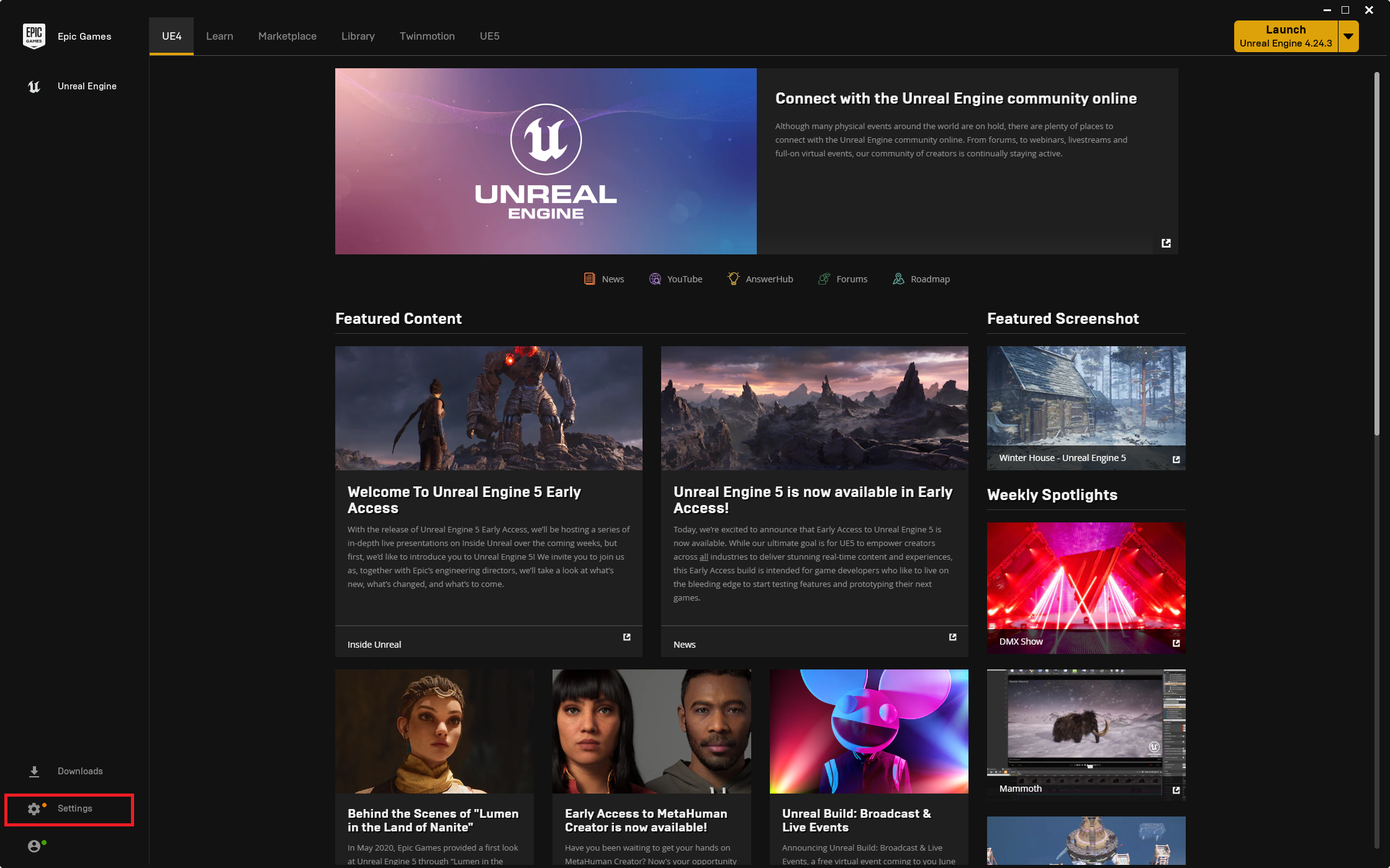 Epic Games Launcher를 열어주시고, 좌측 하단에 Settings 를 열어 설정페이지를 열어줍니다.