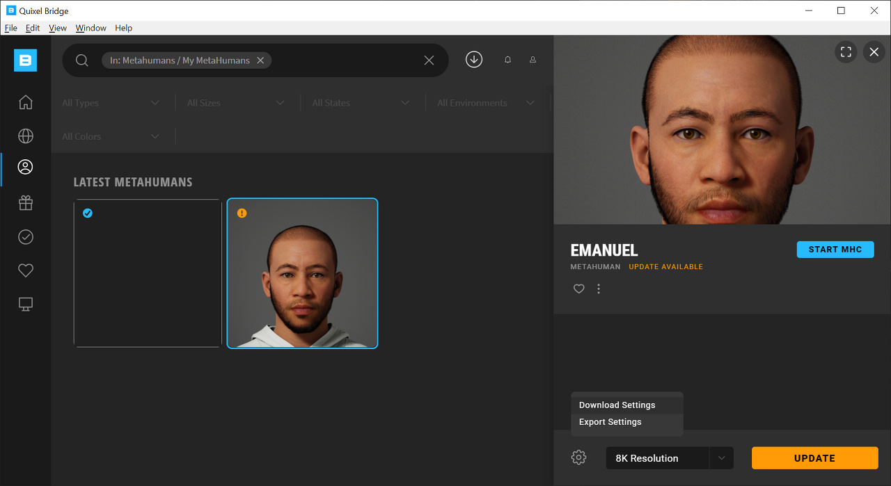 추출할 메타휴먼을 선택하고, 다운로드 세팅 메뉴를 열어줍니다.