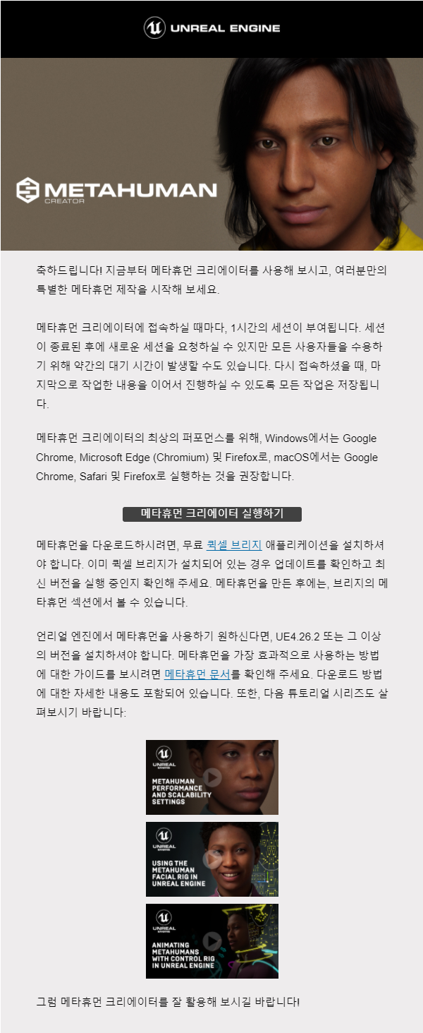 메일으로 도착한 링크를 통해 메타휴먼 클라우드에 접속하고 메타휴먼을 생성합니다.