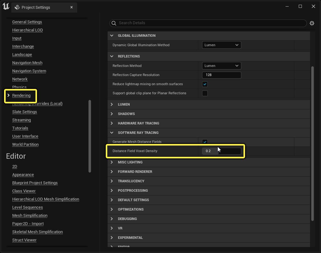 디스턴스 필드 표현을 개선하는 방법에는 2가지가 있습니다. 프로젝트들은 프로젝트 전체에 영향을 미치는 디스턴스 필드 복셀 밀도(Distance Field Voxel Density) 옵션 수치를 올려 개선을 도모할 수 있습니다. 또한, 스태틱 메시 에디터에 있는 디스턴스 필드 해상도 스케일(Distance Field Resolution Scale)을 조절하여 소프트웨어 레이트레이싱에서 문제를 일으키는 메시들에 대해서만 옵션을 지정할 수 있습니다. 디스턴스 필드의 해상도나 밀도를 올리는 것은 프로젝트의 크기를 키우게 될 것입니다.