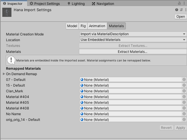 임포트 설정은 해당 에셋을 프로젝트 뷰에서 선택하면 인스펙터에 표기됩니다. 모델 파일 포맷같은 경우 머티리얼이나 텍스쳐 등의 Embeded 리소스가 존재할 수 있습니다. Extract Materials 버튼을 눌러 인덱스에 맞는 기본 머티리얼을 생성할 수 있습니다.