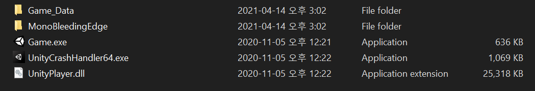 빌드된 유니티 프로그램의 디렉터리를 확인하면 크게 3가지로 구분할 수 있습니다.