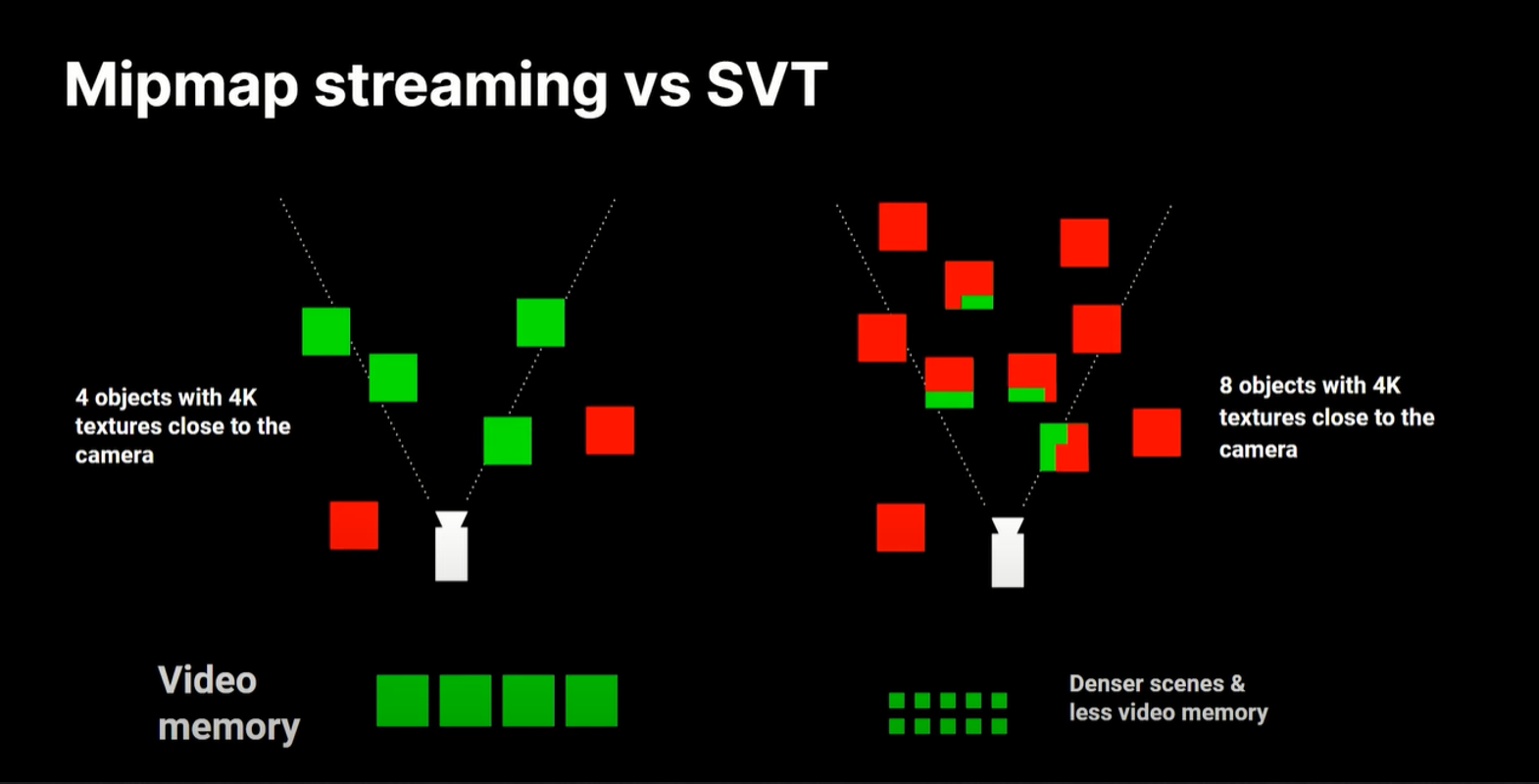 SVT는 텍스처의 일부만 보일 상황에서 4K 텍스처 전체가 비디오 메모리에 올라와야하는 제약을 줄이기 위해 고안되었기 때문에, 재질이 사용하는 텍스처 크기가 작거나 항상 화면에 보이는 텍스처에 대해 사용하는 것은 비효율적입니다.