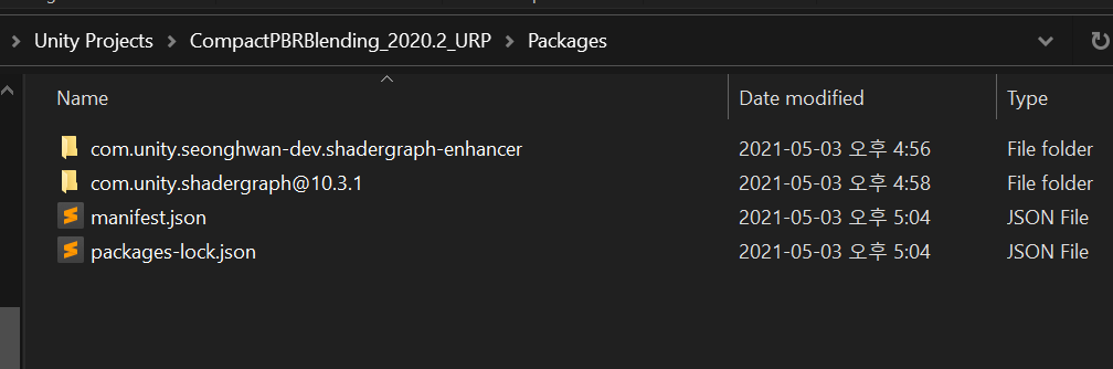 유니티 에디터 프로젝트 뷰에서 Packages 폴더 내 Shader Graph 패키지 폴더를 찾습니다.