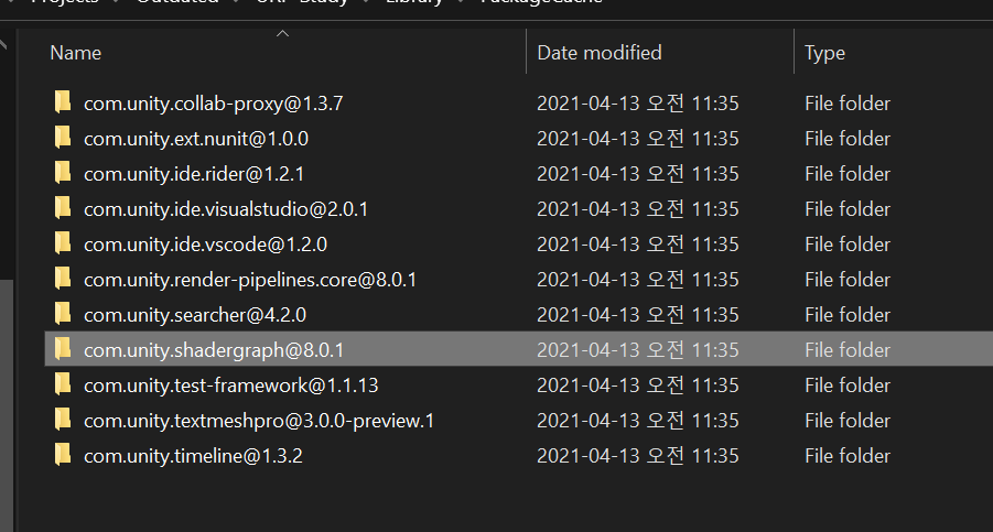 셰이더 그래프 패키지의 디렉터리가 열리면, 상위 폴더로 이동해 com.unity.shadergraph@x.x.x 폴더를 복사합니다.