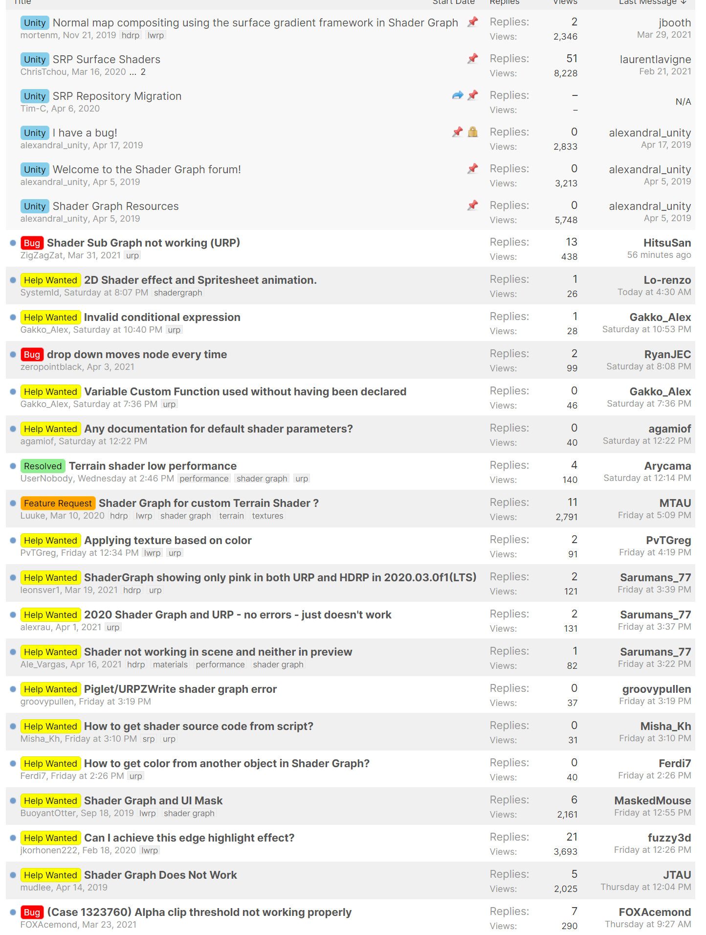 스크립터블 렌더 파이프라인이 도입되면서 유니티에서도 노드 기반 셰이더 에디팅이 가능해졌습니다. 프리뷰 태그는 뗀지 시간이 꽤 지났지만 셰이더랩 문법을 이용해 작성하던 것에 익숙해진 개발자들은 여전히 불편함을 토로하고 있습니다. 제대로 정립되지 않은 규칙들과 느린 개발 속도로 요구되는 기능들이 제때 들어오고 있지 않아 포럼은 말 그대로 불이 난 상태입니다.