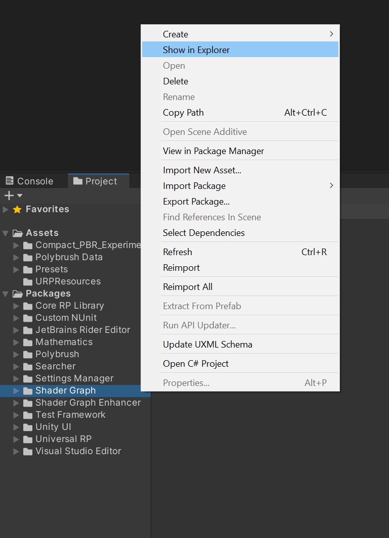 이제 에디터로 돌아와 에셋의 임포트를 기다립니다. 끝나면 다시 에디터 프로젝트 뷰의 Packages/Shader Graph 폴더에 마우스 우클릭 - Show In Explorer 메뉴를 통해 프로젝트경로/Packages/com.unity.shadergraph@x.x.x 위치로 옮겨졌는지 확인합니다.