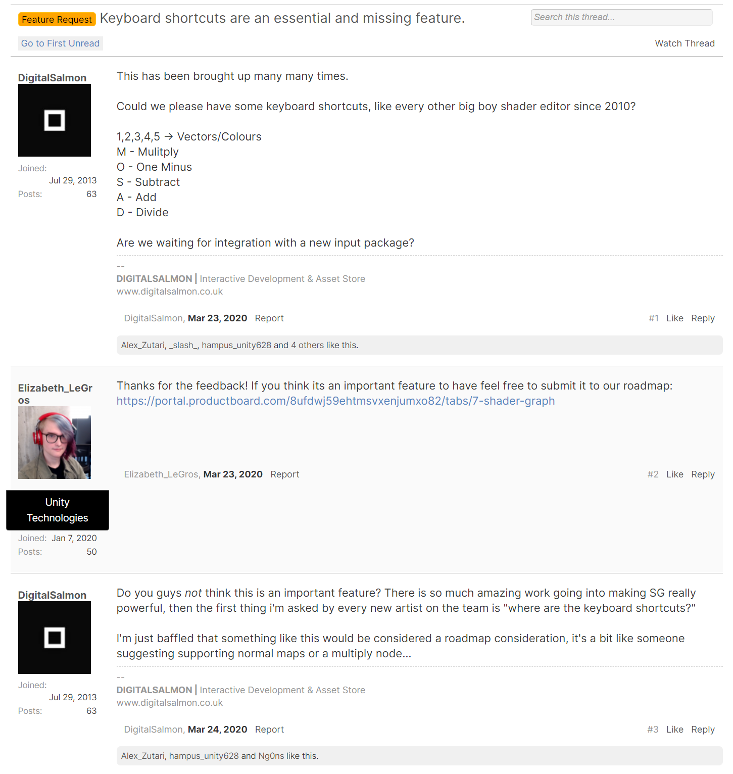 대략적으로, 언리얼 머티리얼 에디터에 있는 기능을 요구하는 포럼 글입니다. 로드맵에 얘기하라는 커뮤니티 매니저의 시큰둥한 답변에 아니나다를까, 사용자들의 마음은 모두 비슷하다는 점을 대변하듯 키보드 단축키 기능만큼 중요한 것이 어디있냐는 반응입니다.